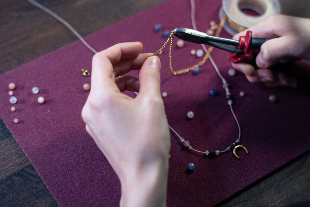 Na początku tworzyłam proste naszyjniki, bransoletki i kolczyki z półfabrykatów ze stopów metali biżuteryjnych, szklanych oraz akrylowych koralików. Z biegiem czasu moja twórczość ewoluowała, zamieniłam metalowe elementy na stal chirurgiczną, a około 5 lat temu zakochałam się w kamieniach naturalnych. Od tego momentu stały się one nieodłącznym elementem moich prac. Dodatkowo, zaczęłam zgłębiać technikę beadingu, czyli ręcznego zszywania koralików, co pozwala mi tworzyć unikalne formy i kształty. Czasem sięgam także po technikę wire-wrappingu, np. oplatając kamienie drutem miedzianym, czy tworząc pierścionki lub zawieszki.