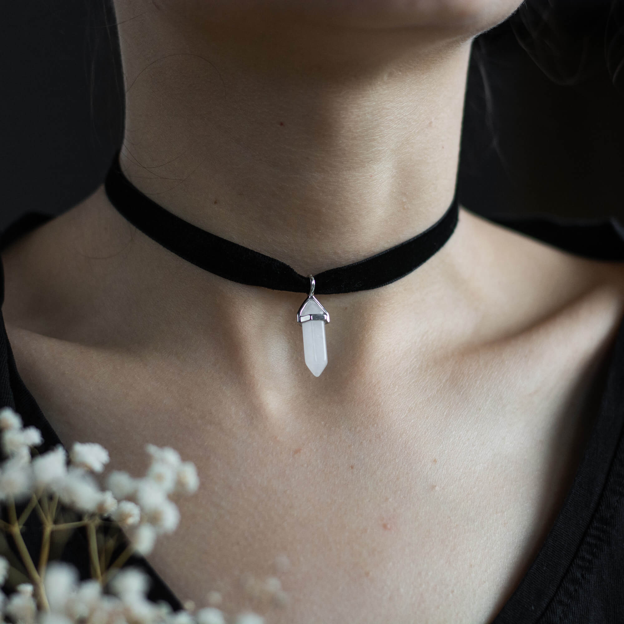 Aksamitka na szyję z zawieszką z kwarcu mlecznego w kształcie kryształka. Przyjemna w dotyku i miła dla skóry. Rozmiar regulowany umożliwiający dostosowanie do obwodu szyi. Zapięcie wykonane ze stali chirurgicznej odpornej na czynniki zewnętrzne – nie ciemnieje i nie zmienia koloru!
