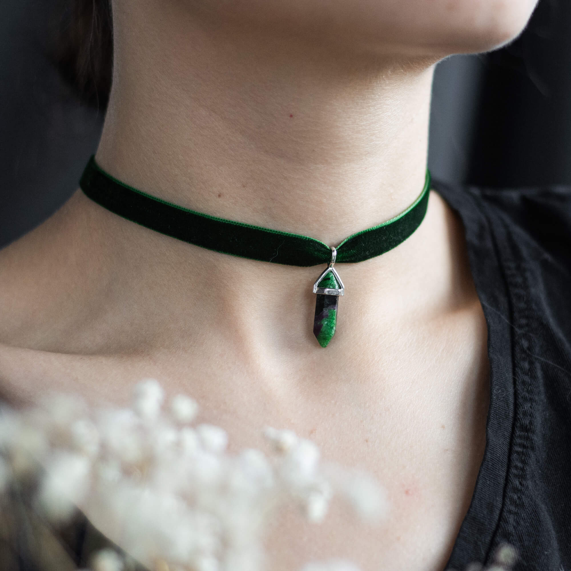 Czarna aksamitka na szyję z zawieszką zoisytu z rubinem w kształcie kryształku.