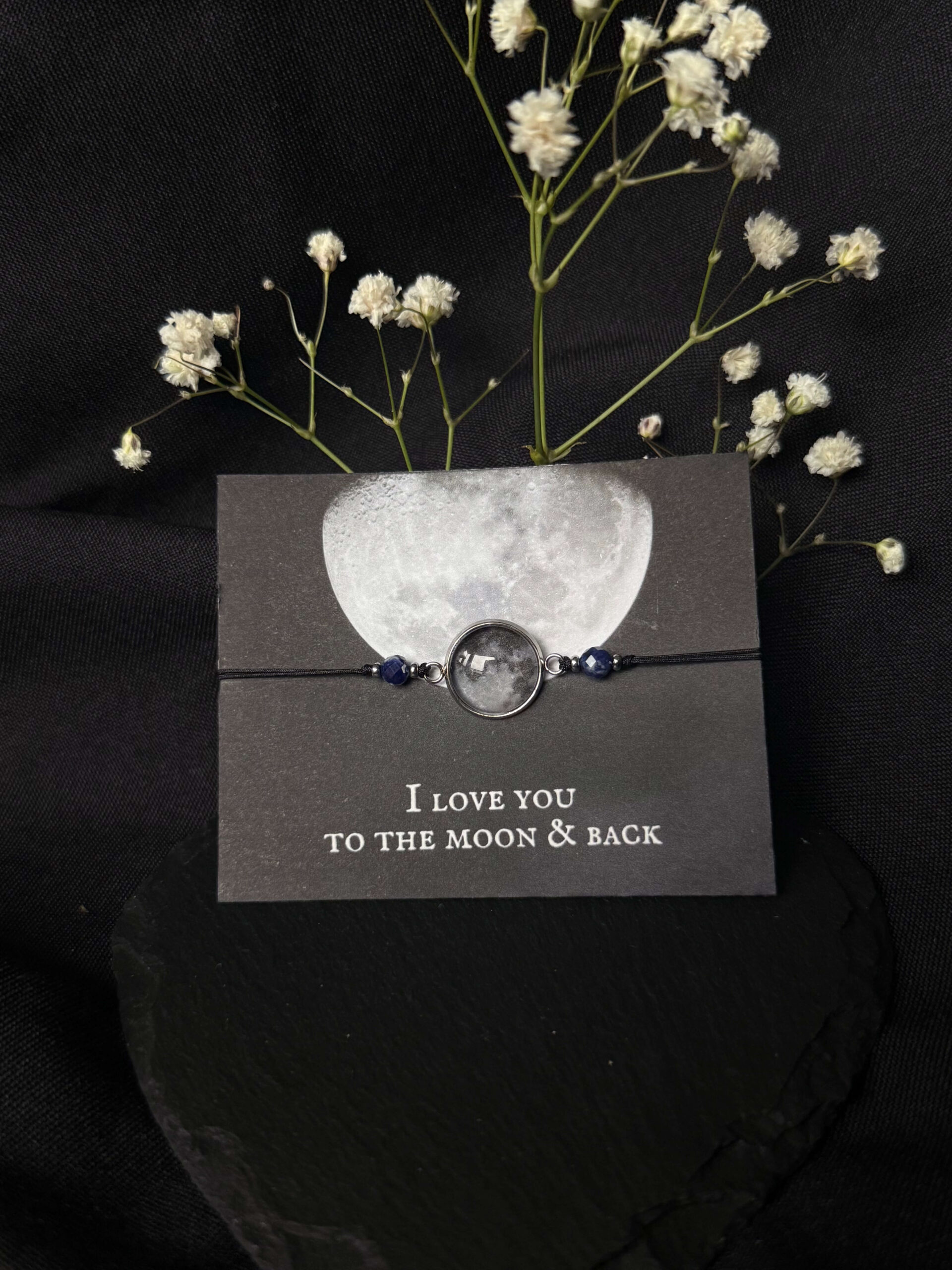 Bransoletka ze szklanym księżycem i sodalitem, na kartoniku „I love you to the moon & back”