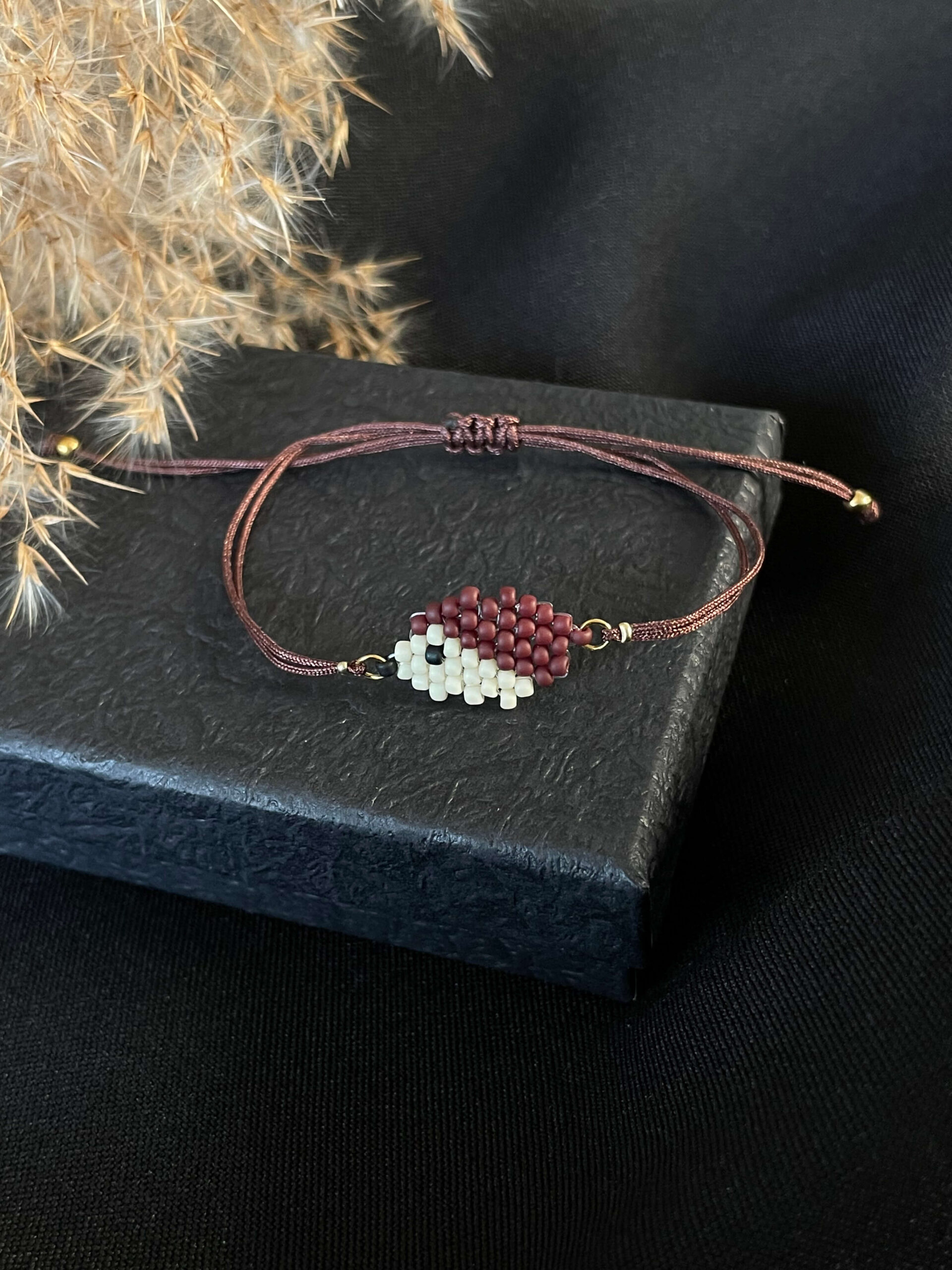 Bransoletka z ręcznie szytym jeżem na regulowanym sznurku.