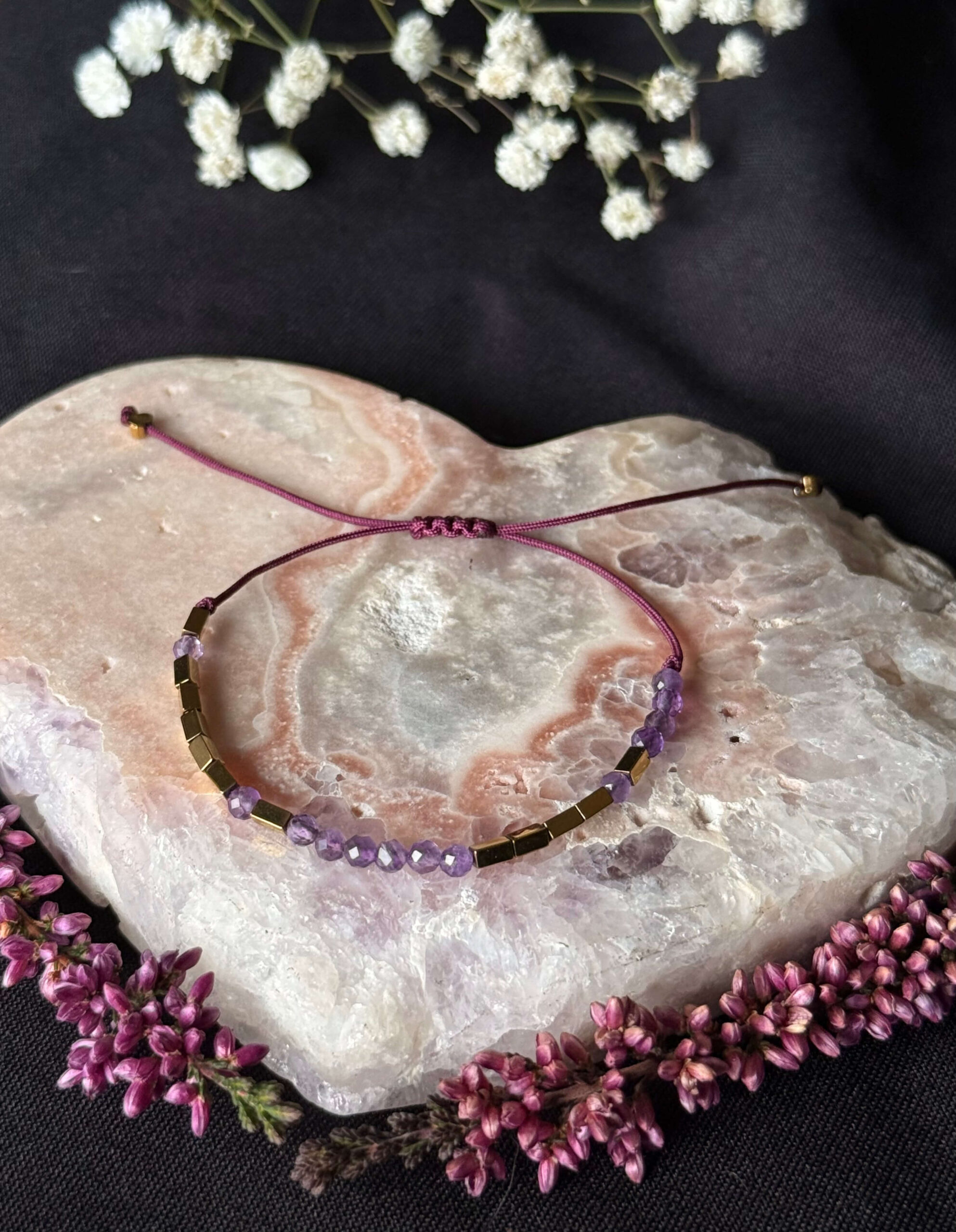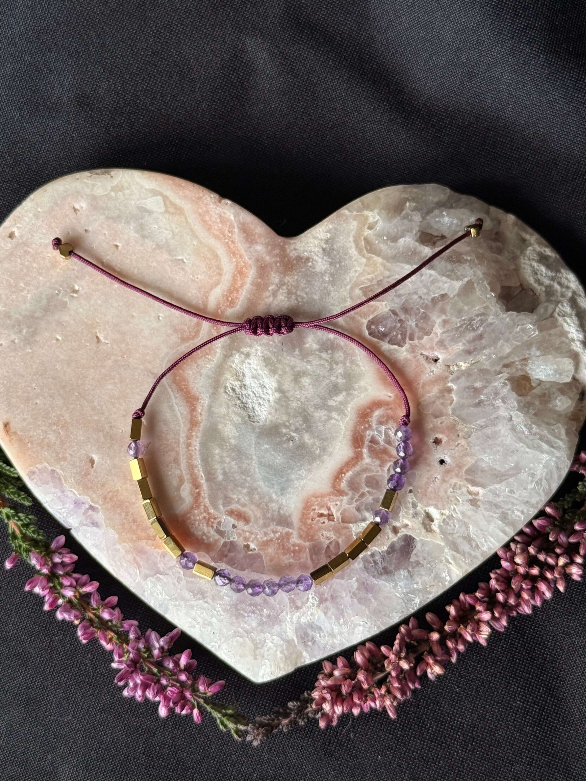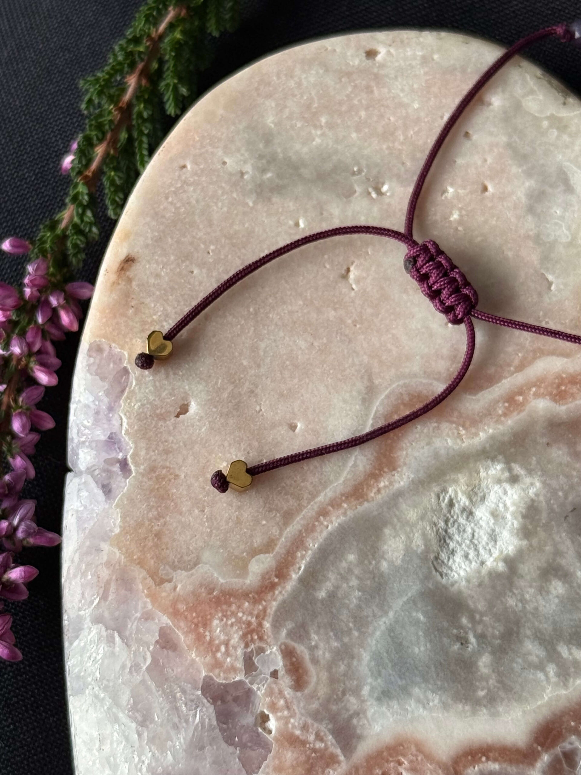 • sznurek w kolorze śliwkowym podbija kolor ametystu i dodaje mu pięknej, fioletowej głębi,