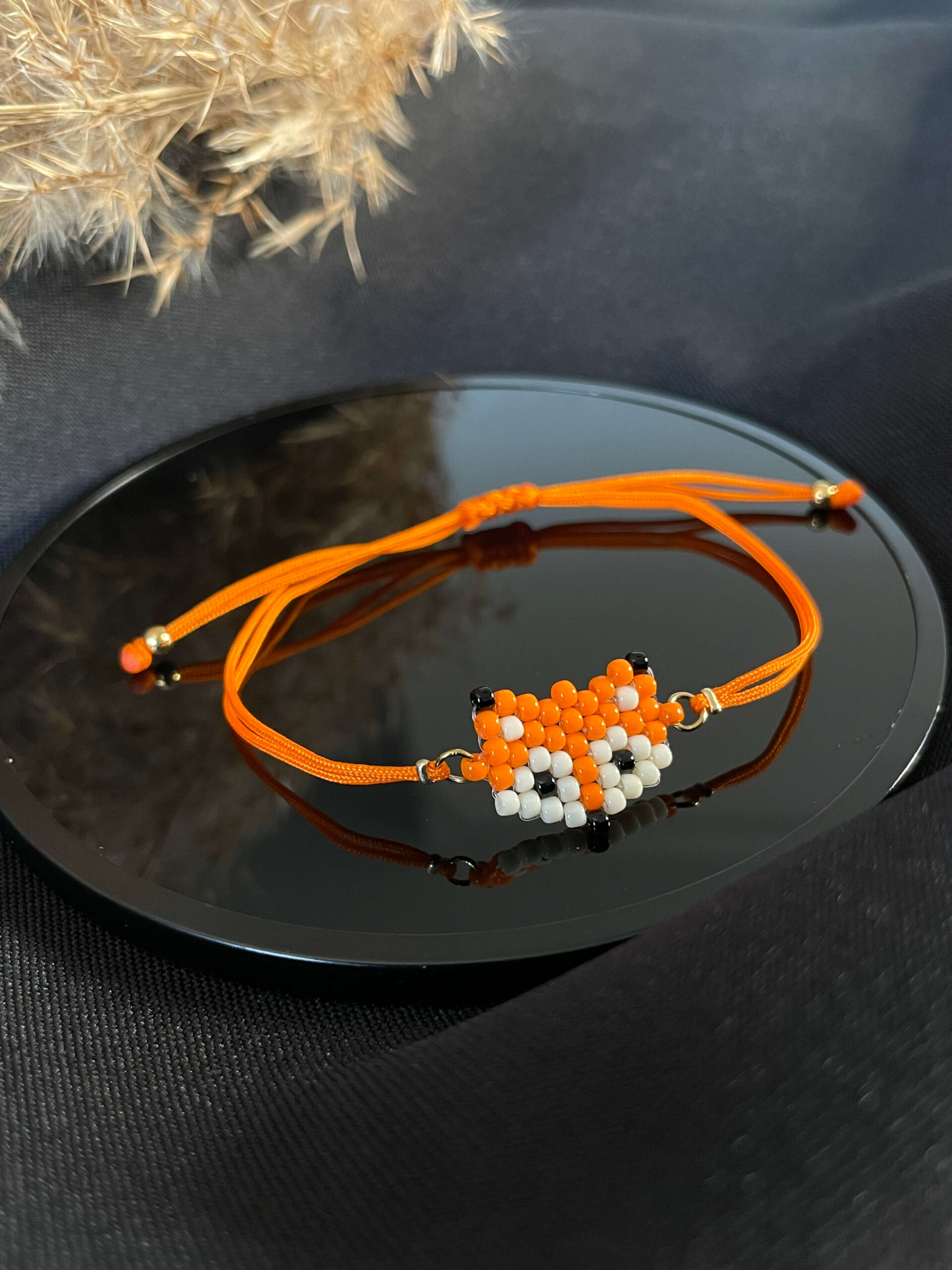 Bransoletka z ręcznie szytym liskiem na pomarańczowym sznurku z regulowanym zapięciem.