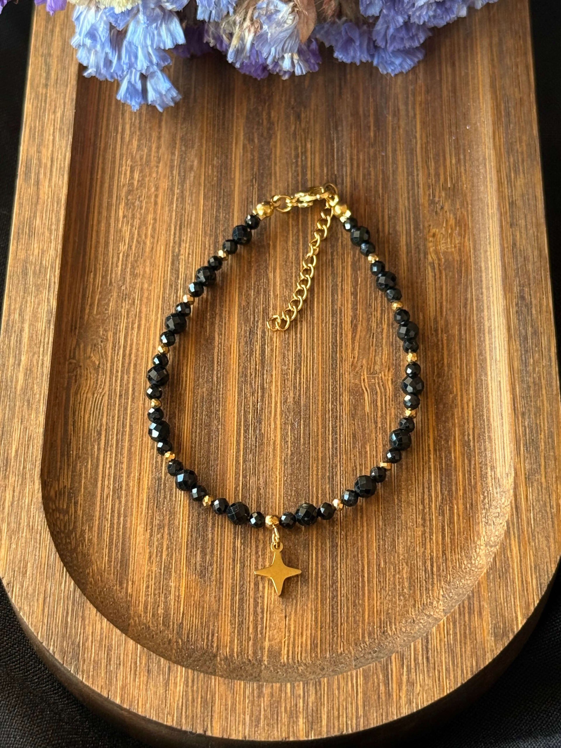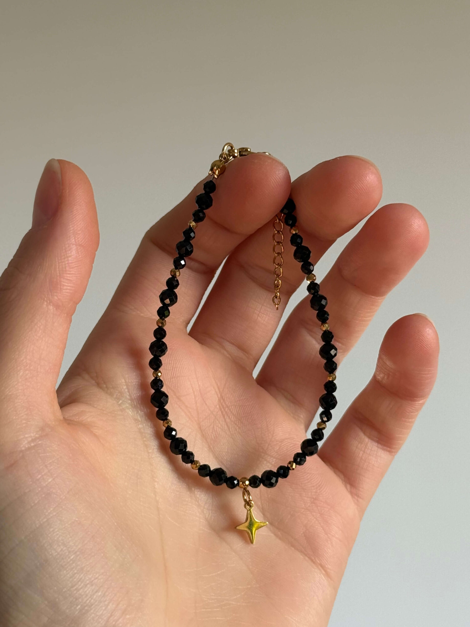Bransoletka wykonana z fasetowanych kulek czarnego turmalinu wielkości 3 i 4mm oraz przekładek z pozłacanego hematytu z zawieszką gwiazdki.