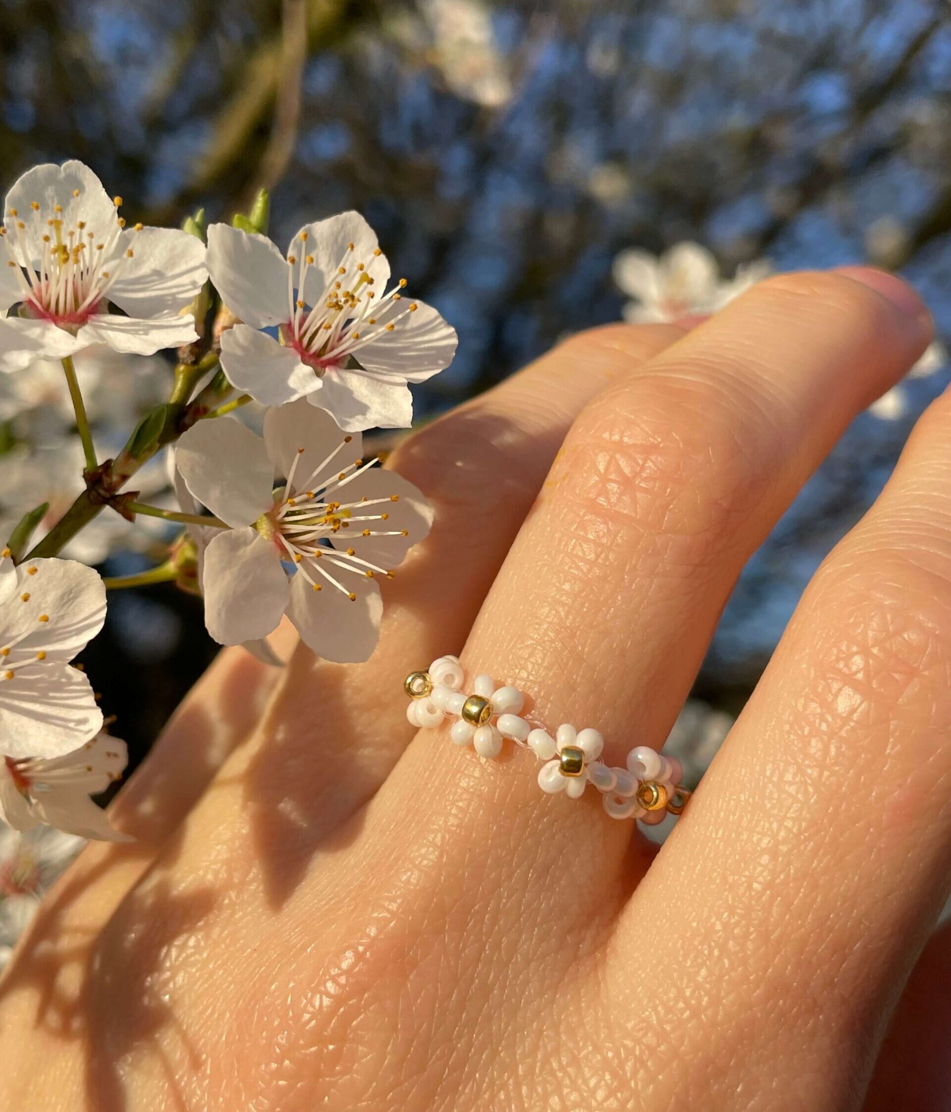 Pierścionek z kwiatuszkami wykonany ze szklanych czeskich koralików Preciosa w kolorze białym i japońskich TOHO w kolorze złotym.