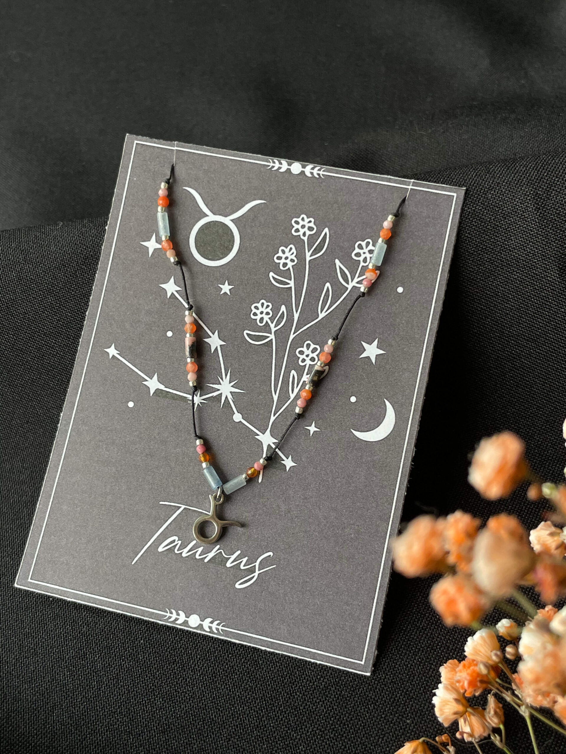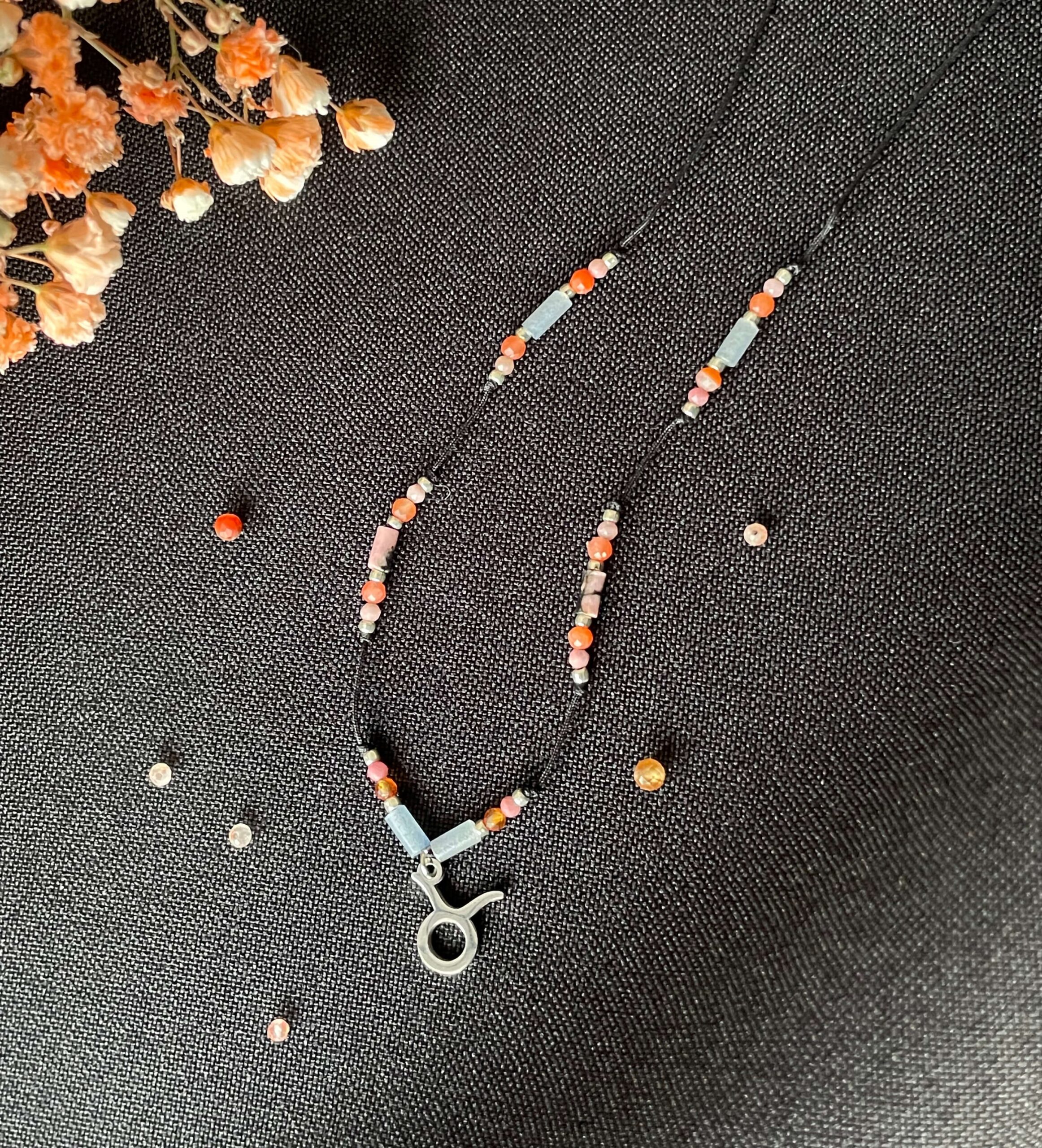 Ręcznie wykonany naszyjnik, dedykowany dla osób urodzonych pod znakiem Byka (21.04.-20.05.). Wykonany z kamieni naturalnych: awenturynu, rodonitu i karneolu, stanowi doskonały wybór dla tych, którzy pragną harmonii i elegancji w swoim codziennym stylu.