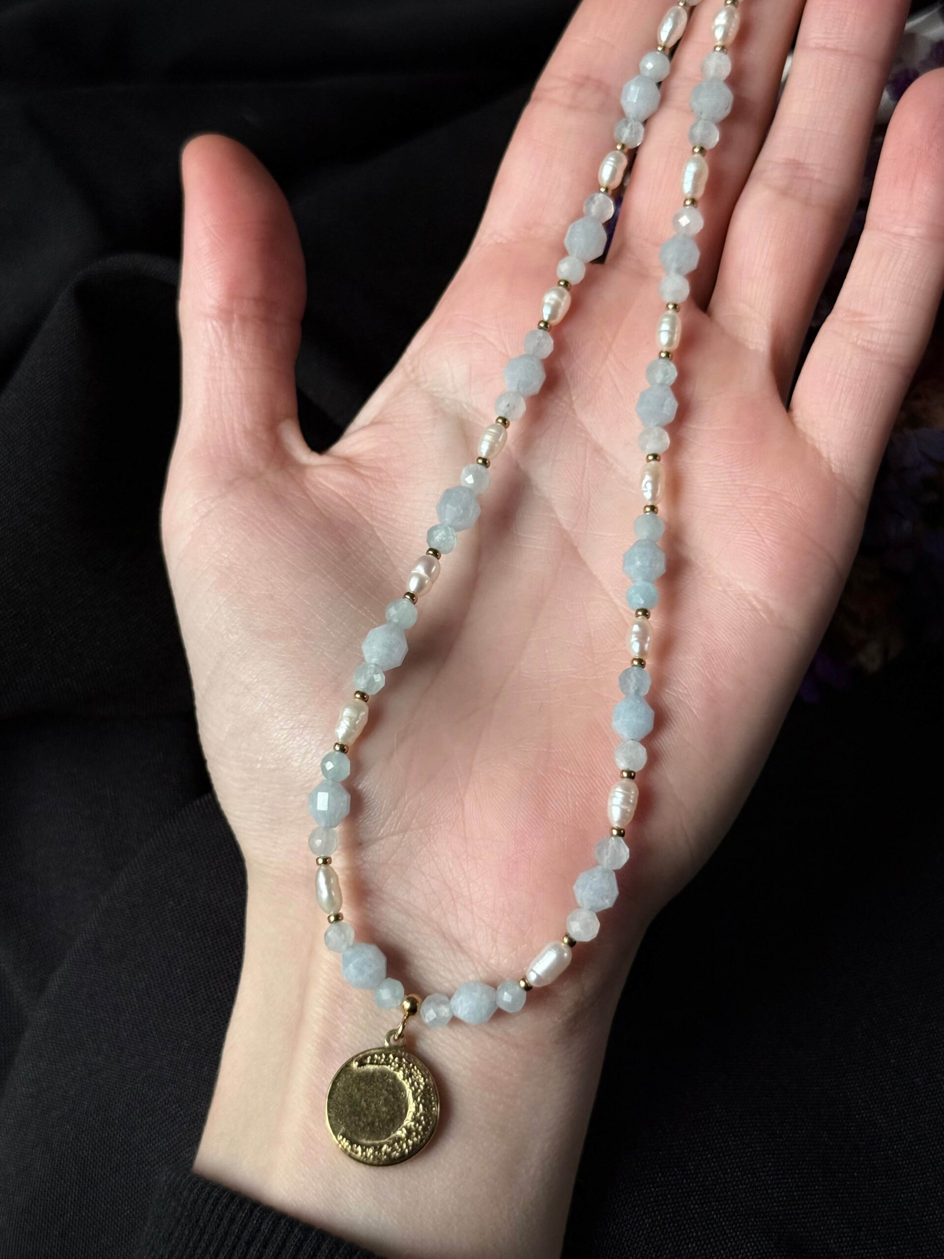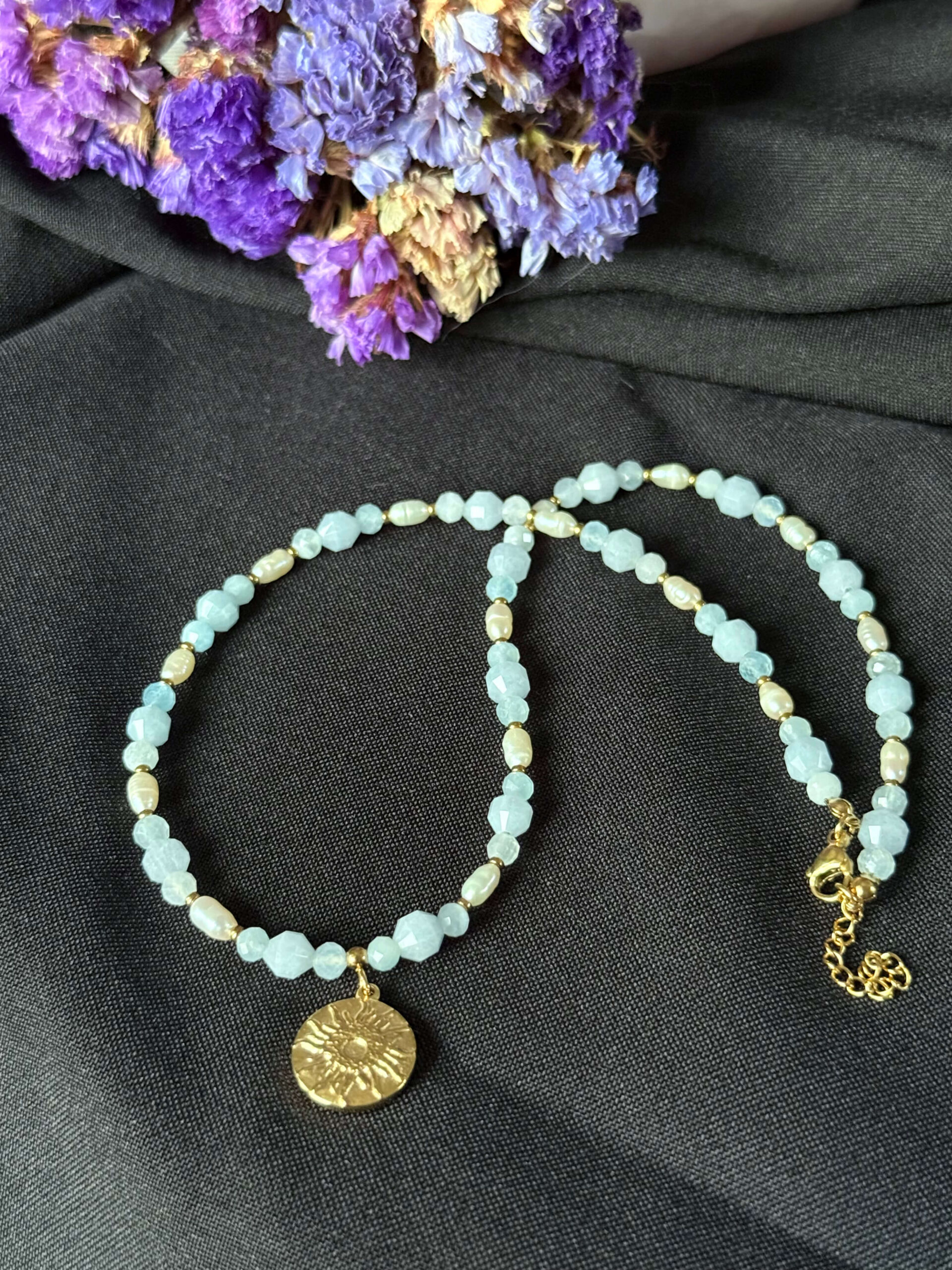 Naszyjnik wykonany z fasetowanych kulek i baryłek akwamarynu i naturalnych pereł hodowlanych poprzekładanych dyskami z pozłacanego hematytu. Wykończony dwustronną zawieszką z pozłacanej stali nierdzewnej ze słońcem i księżycem.
