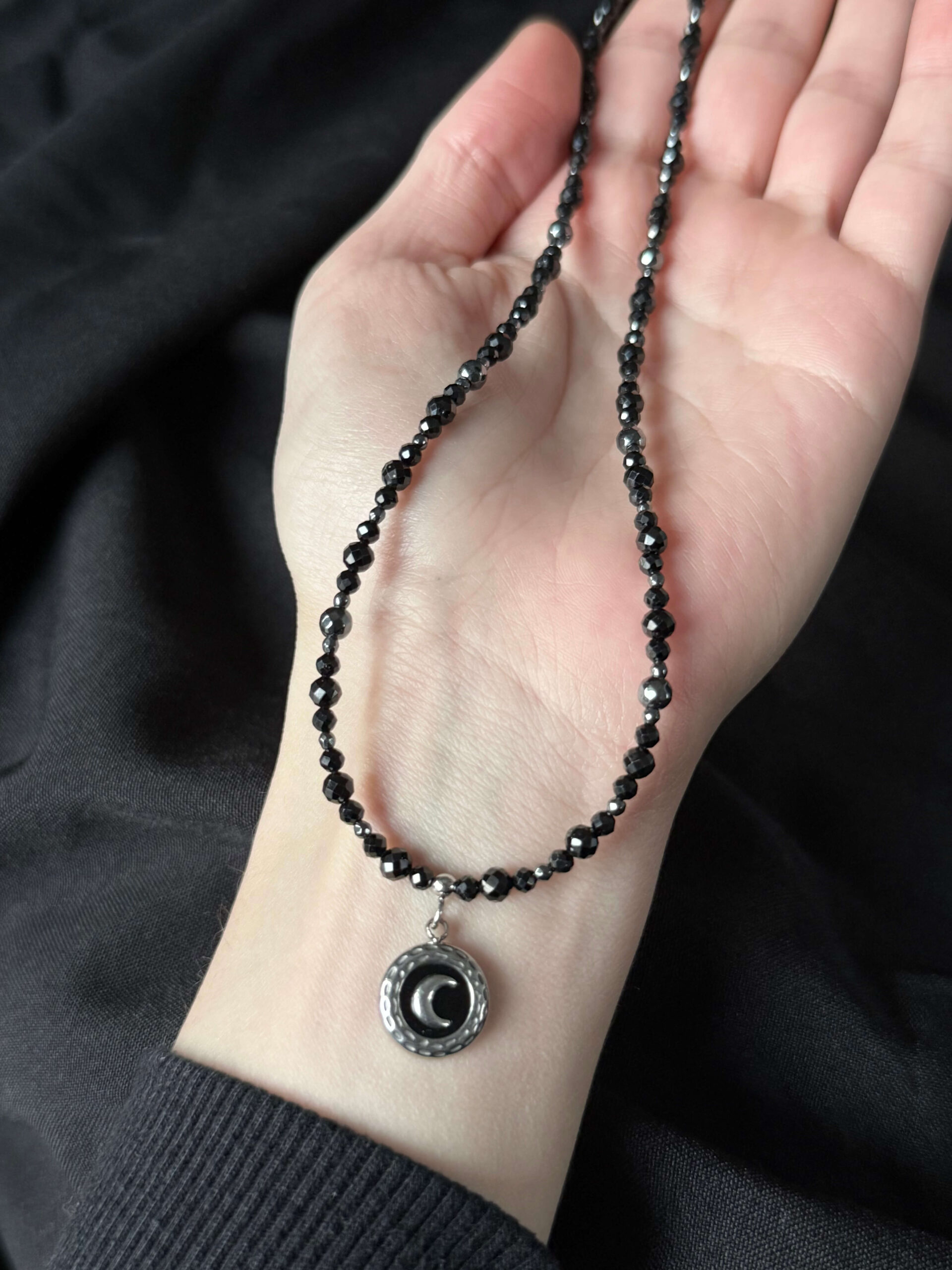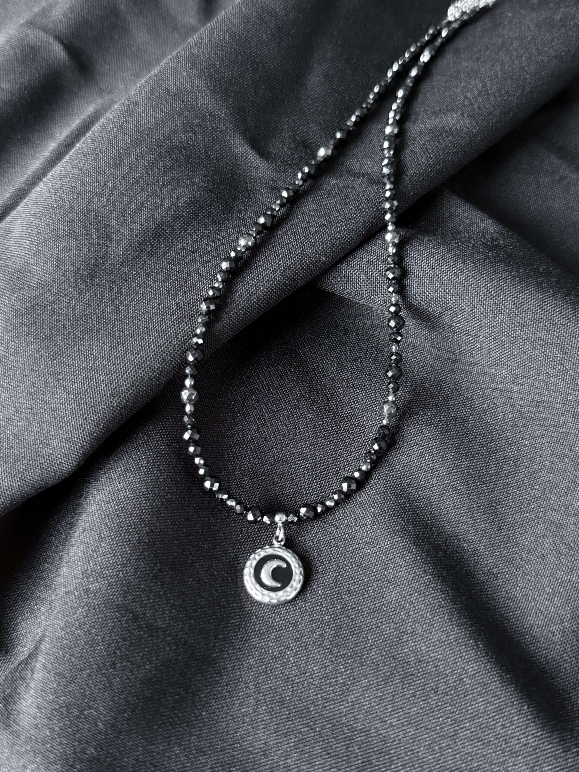Naszyjnik wykonany z 3 i 4mm fasetowanych koralików czarnego turmalinu oraz 2mm kulek hematytu w naturalnym kolorze, wykończony zawieszką w kształcie monetki z księżycem otoczonym czarną emalią.