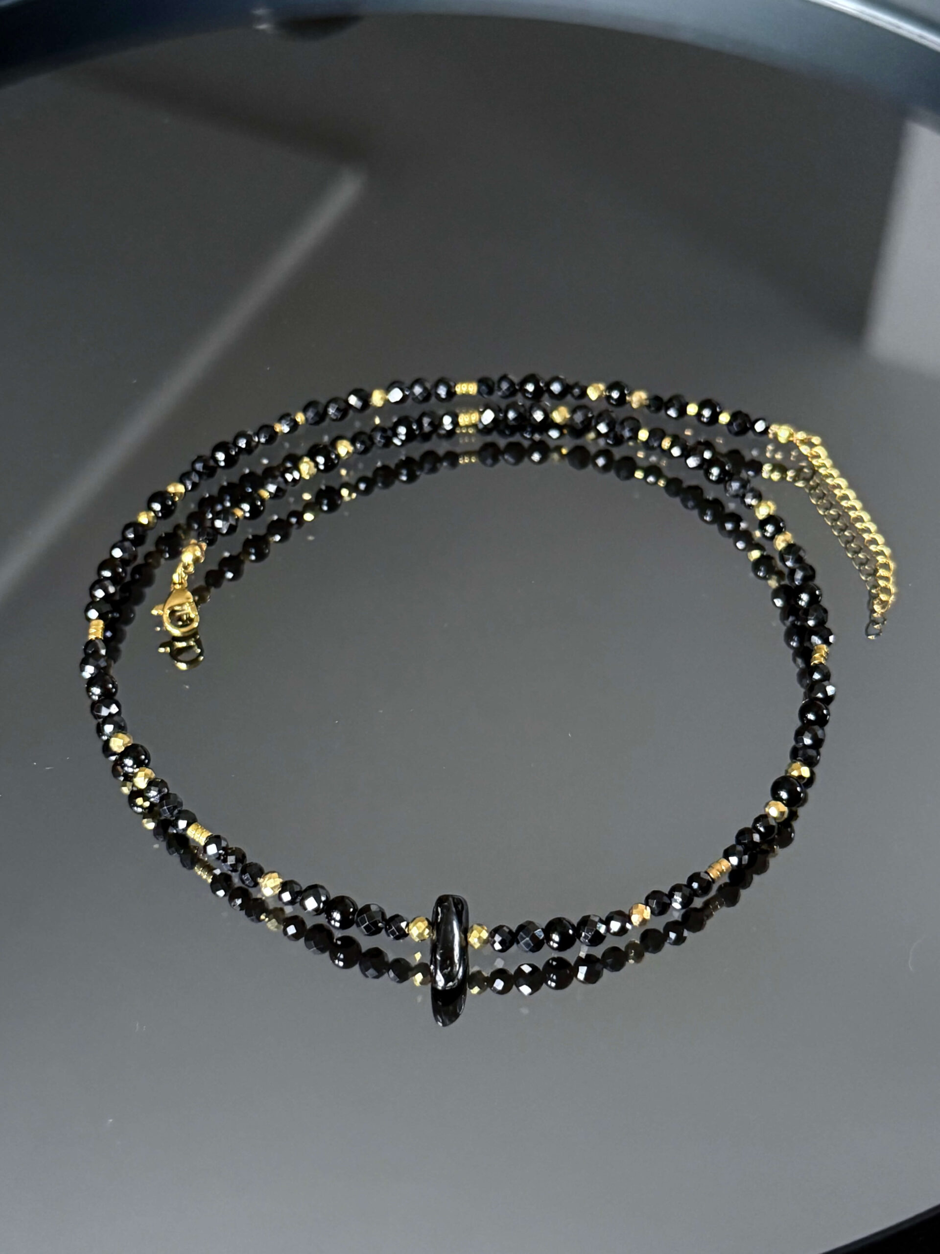 Naszyjnik wykonany z 3 i 4mm fasetowanych i gładkich koralików czarnego turmalinu oraz 3mm kulek i 1mm dysków hematytu, z bryłką czarnego turmalinu na środku.