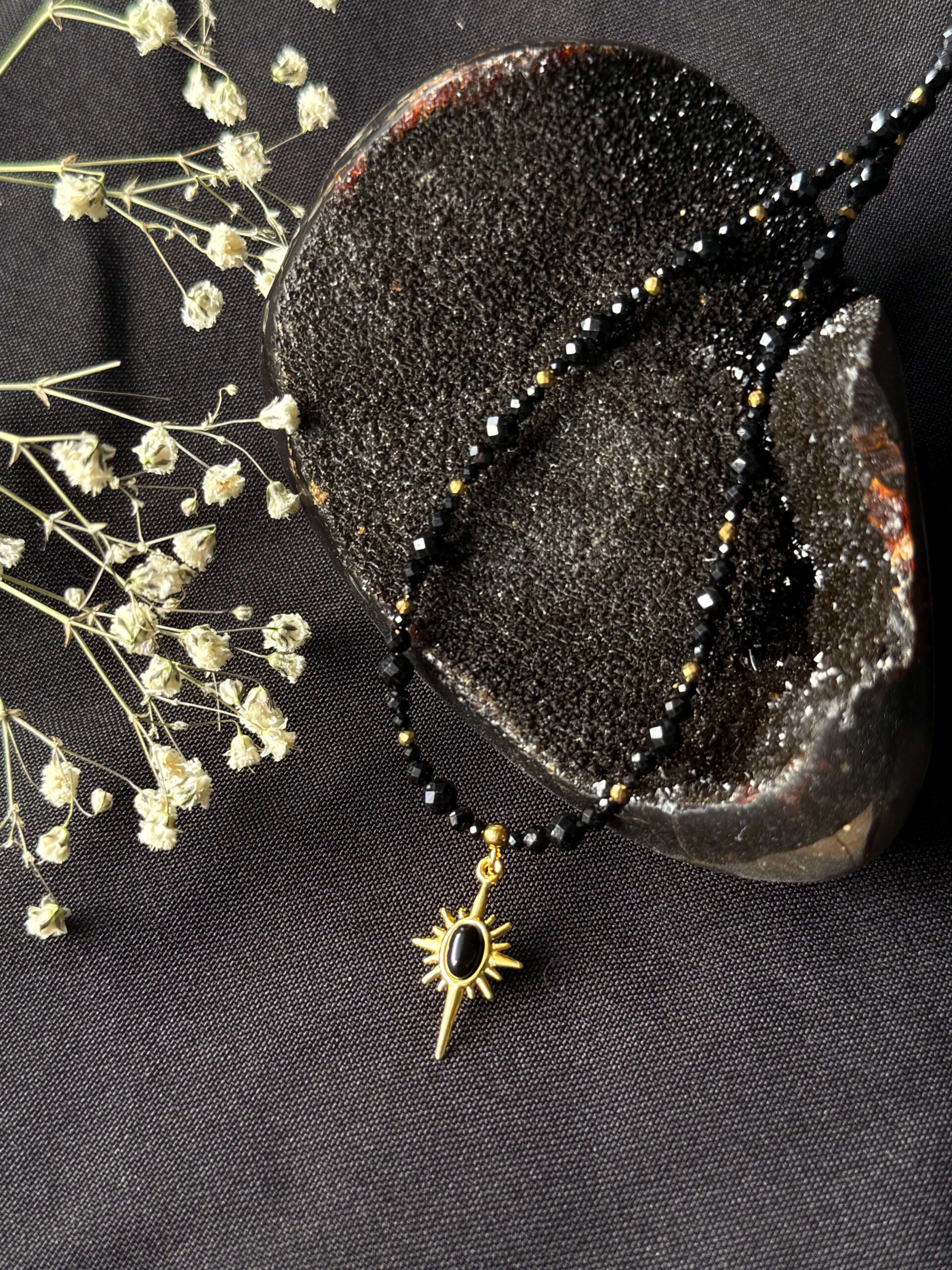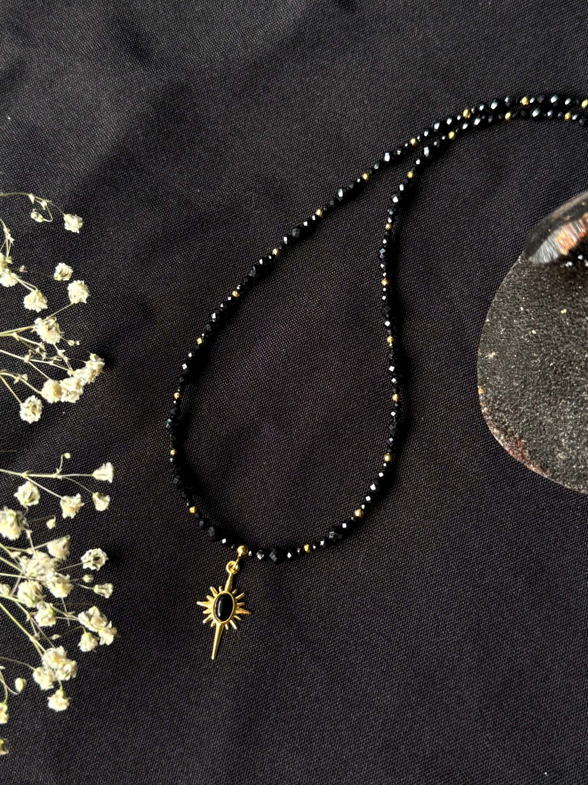 Naszyjnik z czarnym turmalinem, onyksem i zawieszką w kształcie słońca