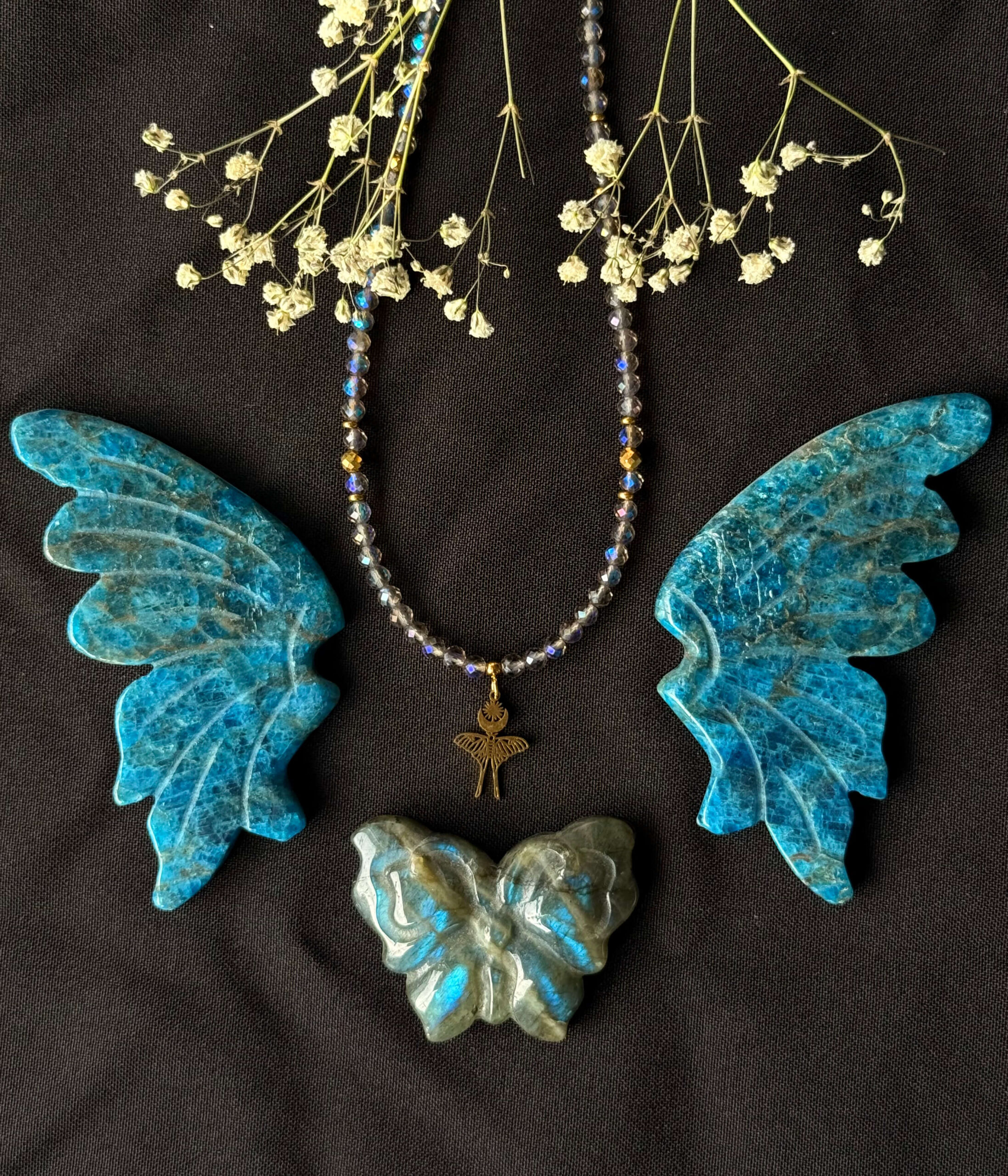 Naszyjnik z galwanizowanego kwarcu dymnego i hematytu z zawieszką ćmą