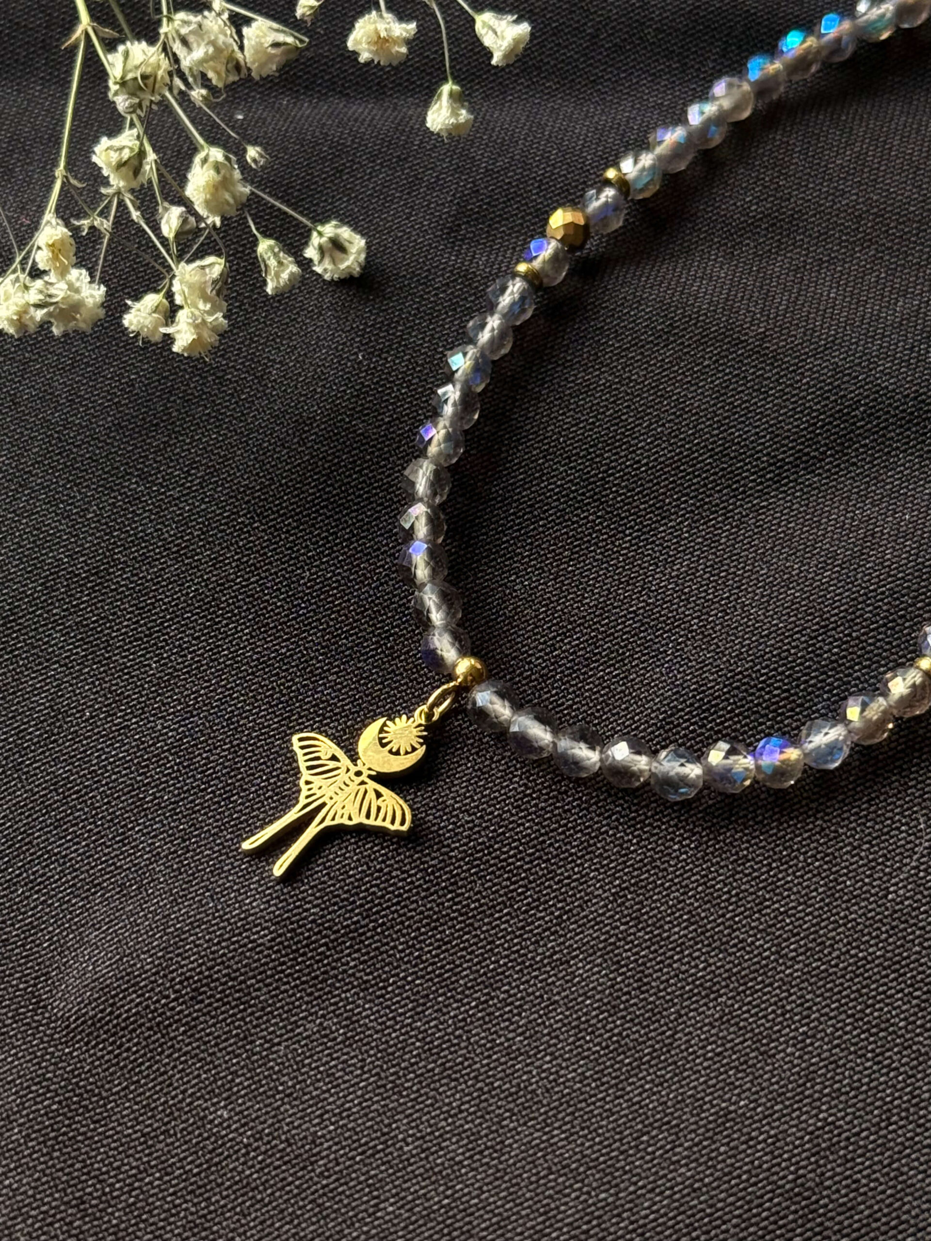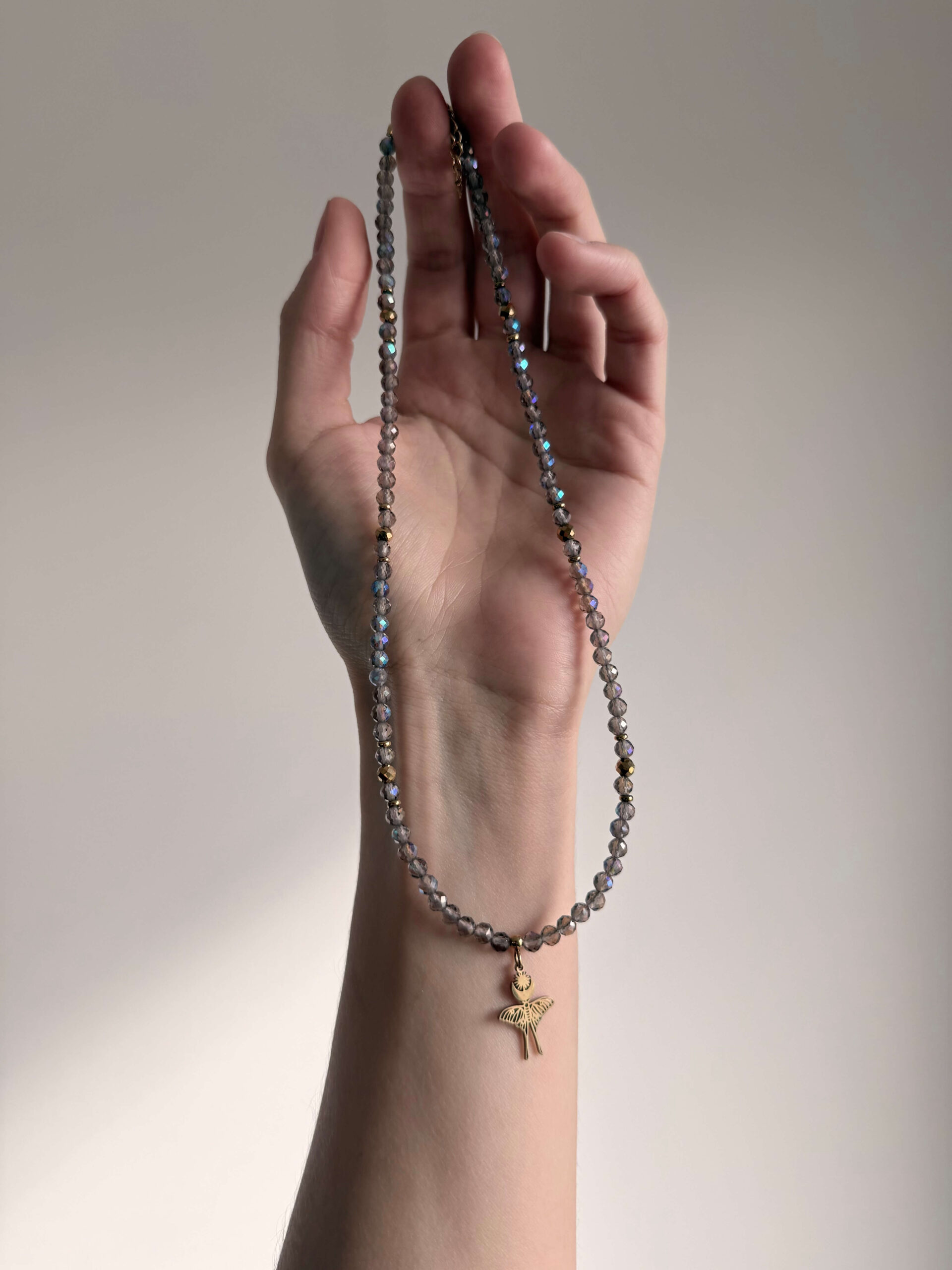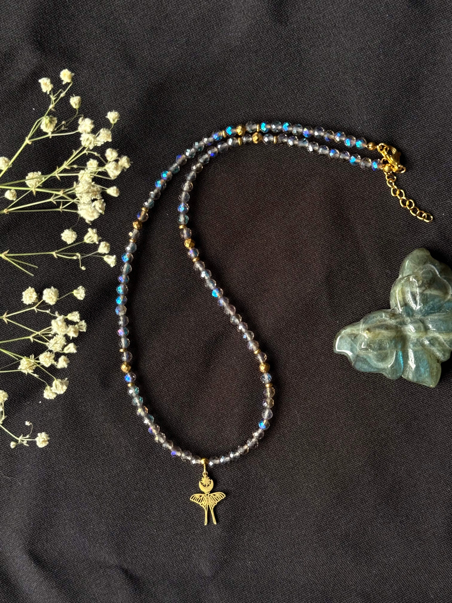 Naszyjnik wykonany z 4mm fasetowanych koralików z kwarcu dymnego galwanizowanego i kulek oraz przekładek z pozłacanego hematytu, ze stalową zawieszką w kształcie ćmy z księżycem.
