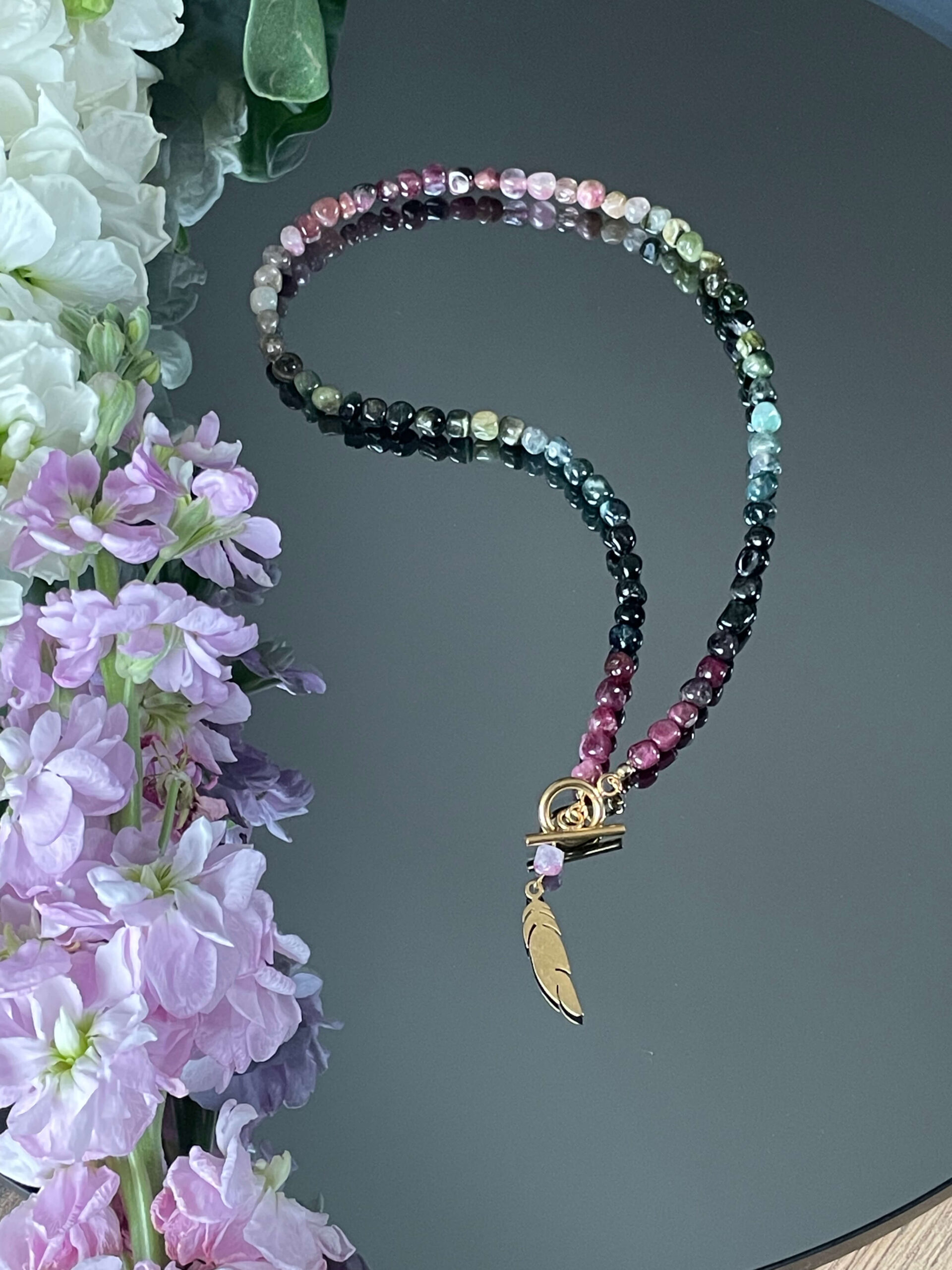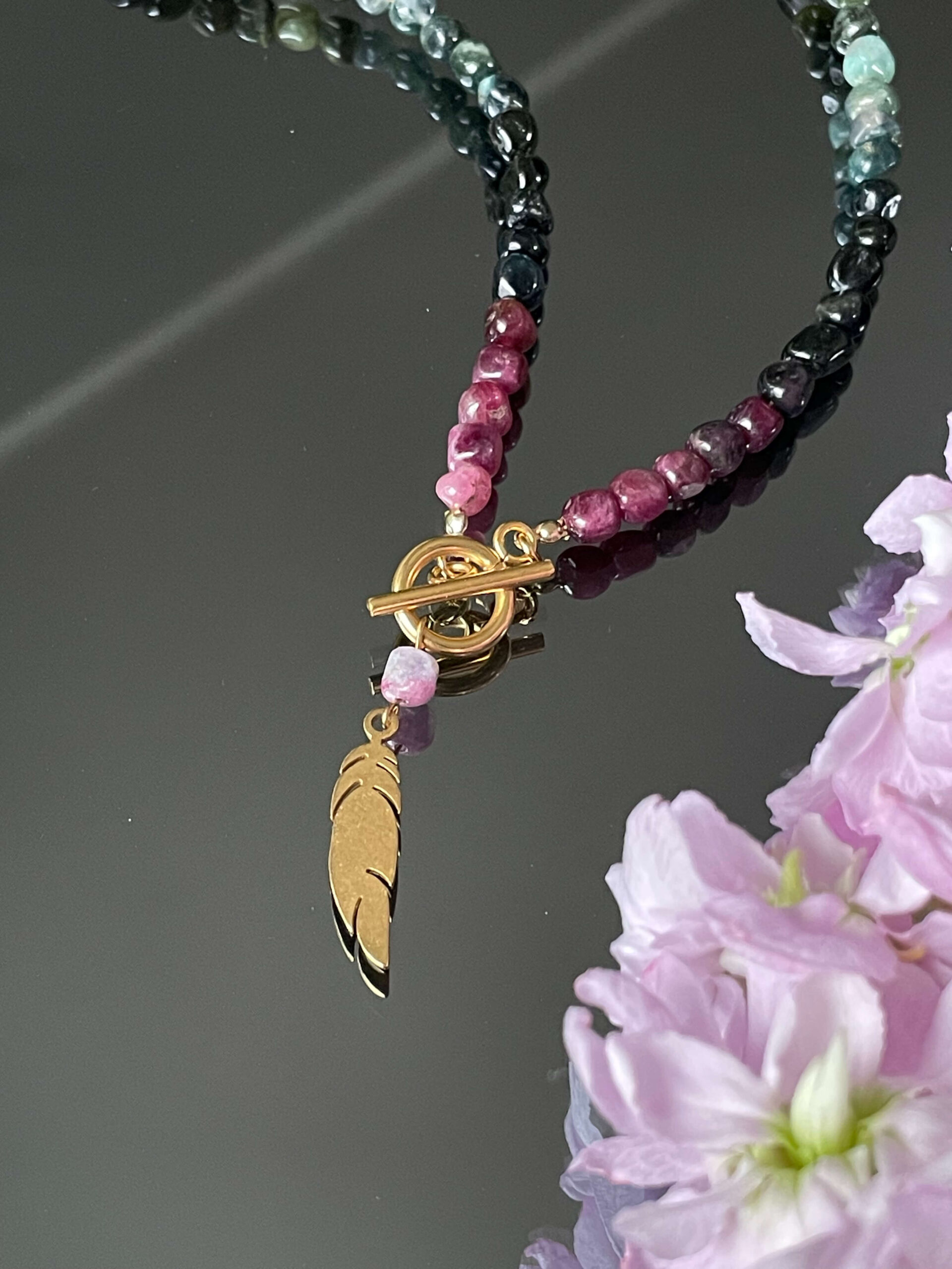 Naszyjnik wykonany na japońskiej lince jubilerskiej, zawiera kolorowy turmalin w formie nieregularnych bryłek w rozmiarze ok. 5mm. Naszyjnik ozdobiony subtelną zawieszką w kształcie piórka z pozłacanej stali chirurgicznej.