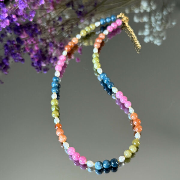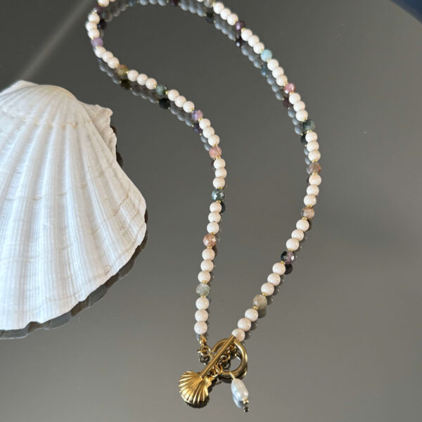 Naszyjnik z kamieniem rzecznym, kolorowym turmalinem i perłą