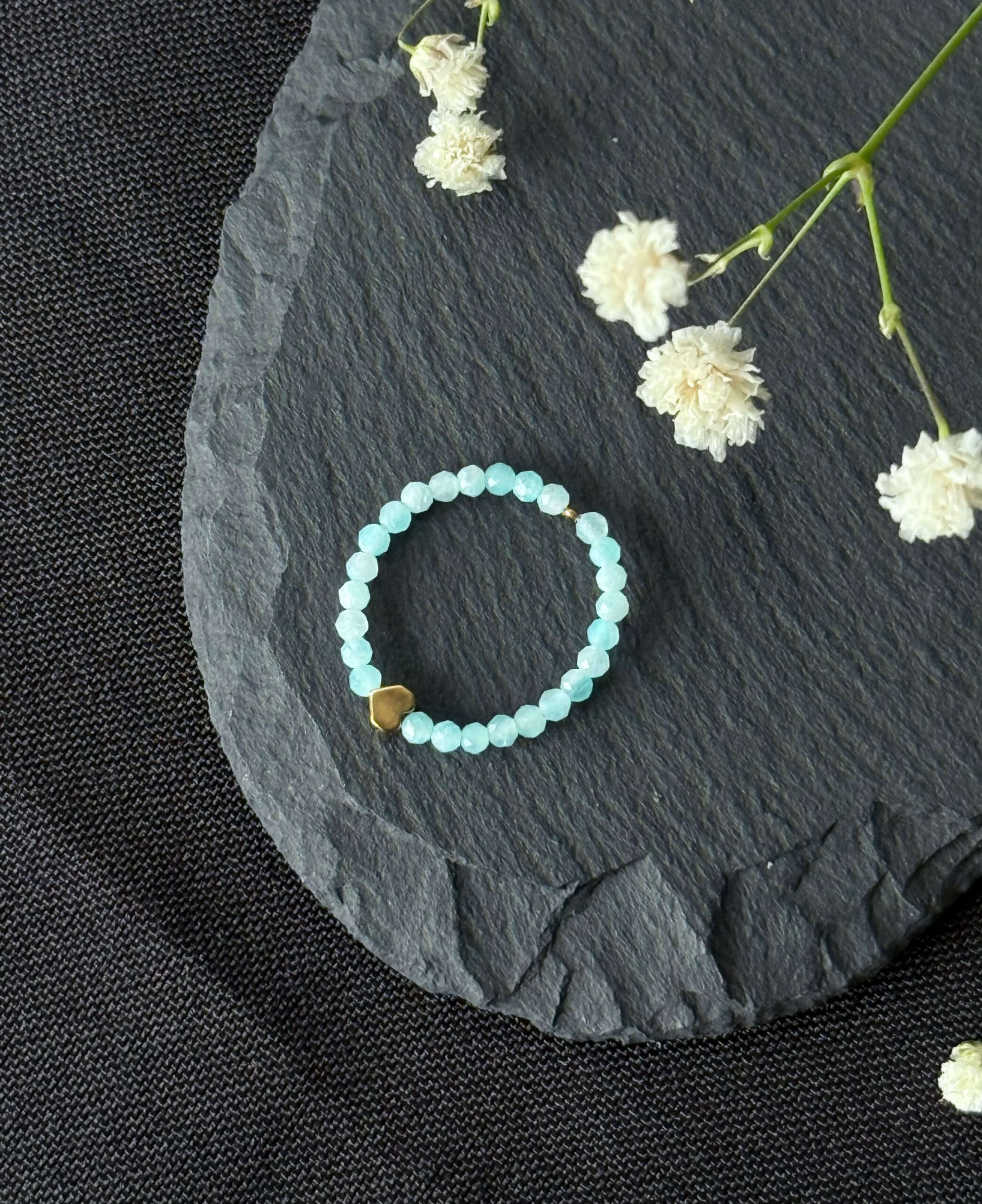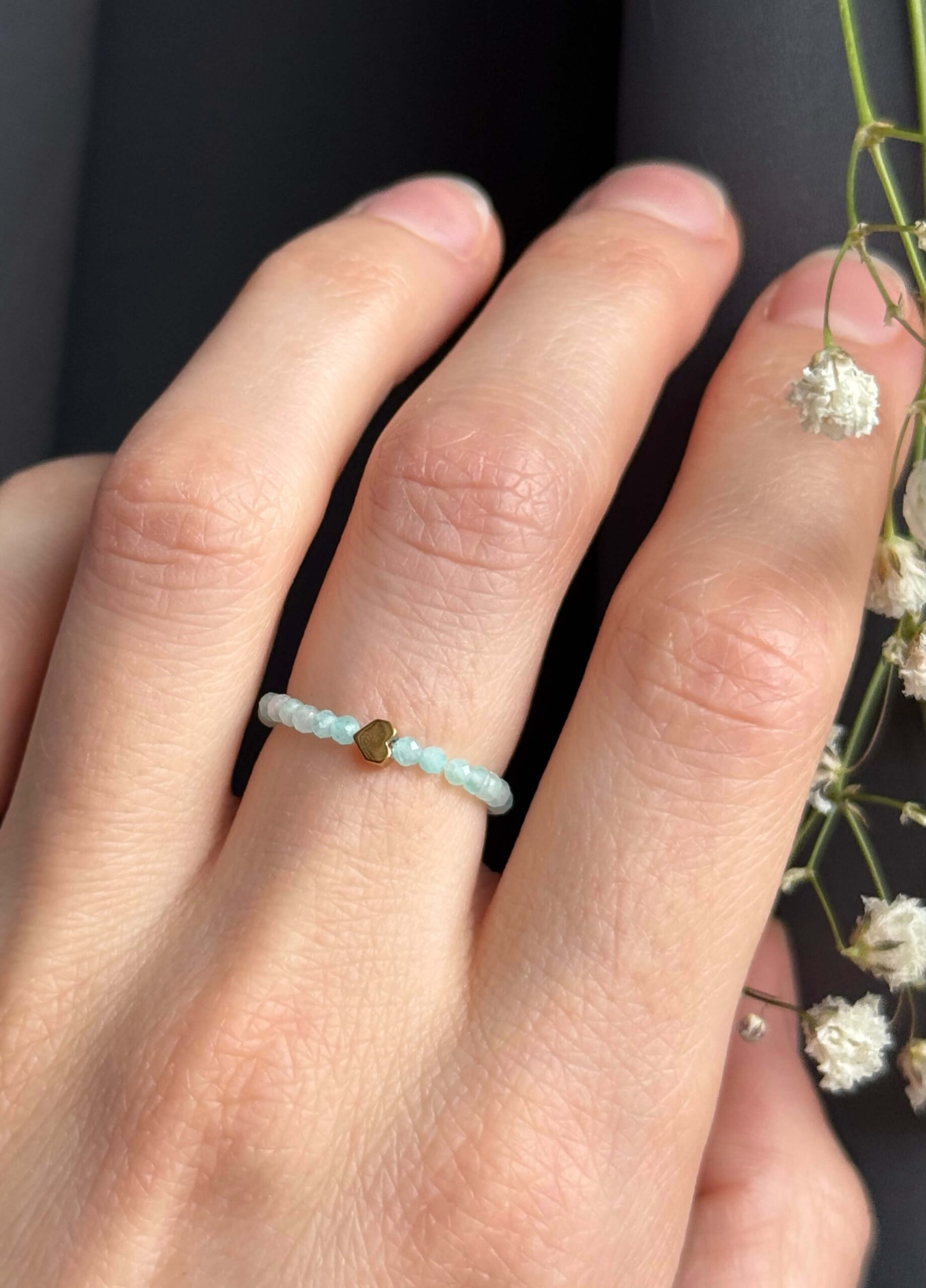 Pierścionek elastyczny z amazonitem i mini serduszkiem
