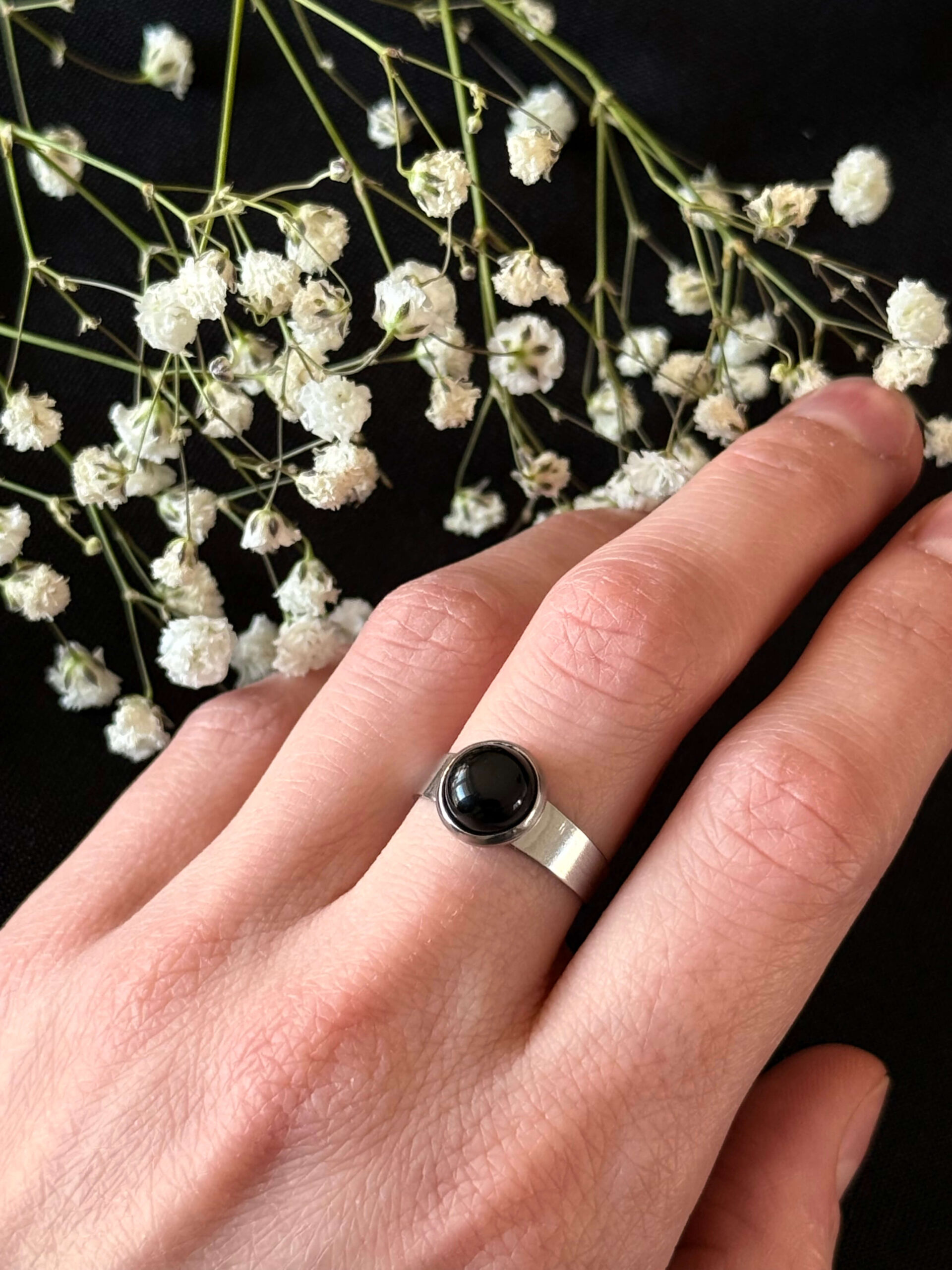 Pierścionek z kaboszonem z onyksu w okrągłym kształcie na szerokiej obrączce ze stali nierdzewnej.