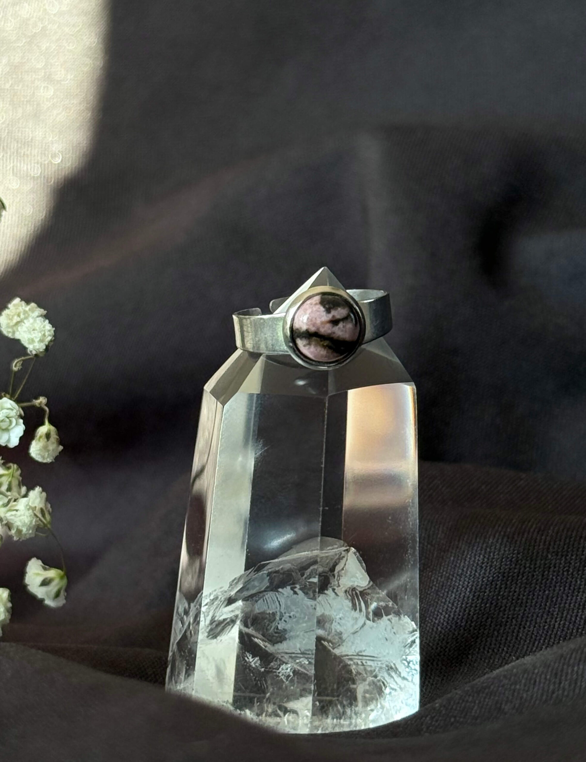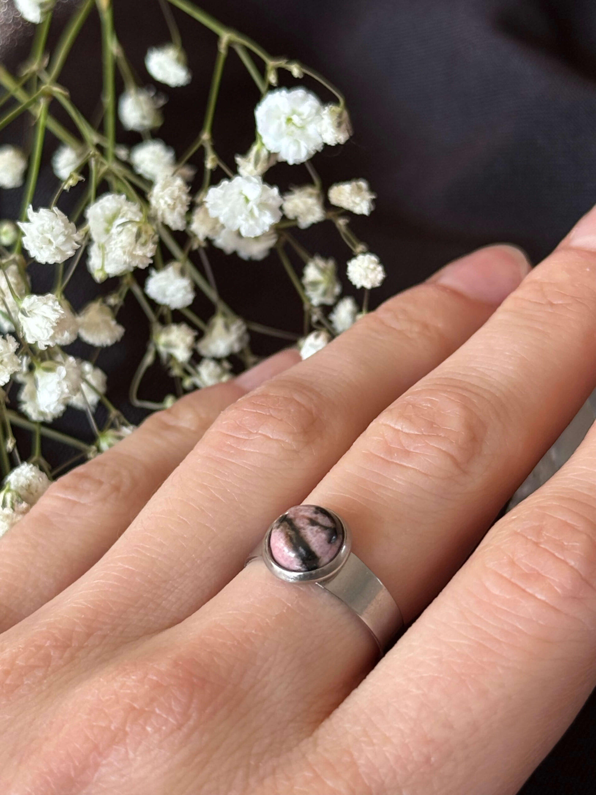 Pierścionek ze stali nierdzewnej srebrnej z rodonitem