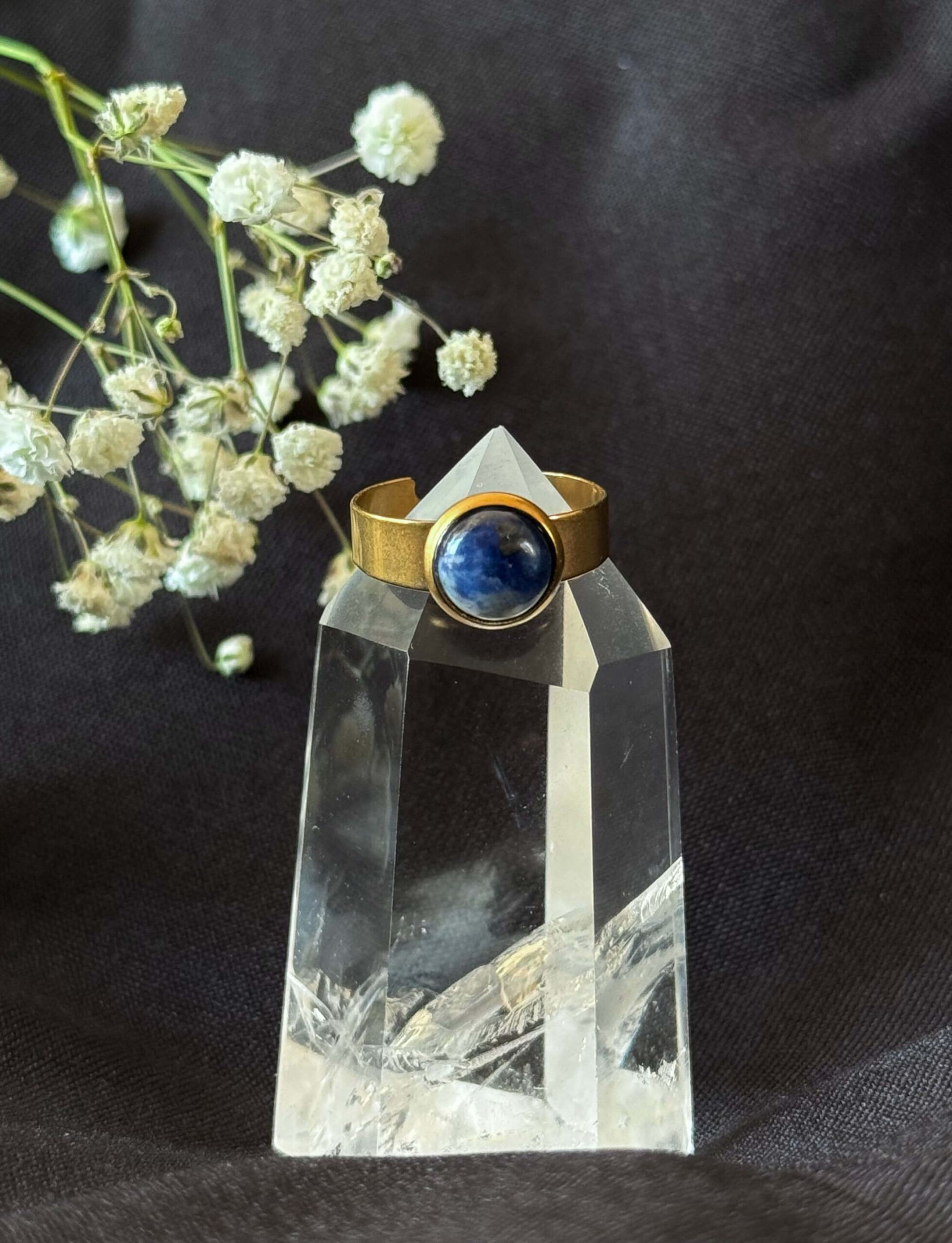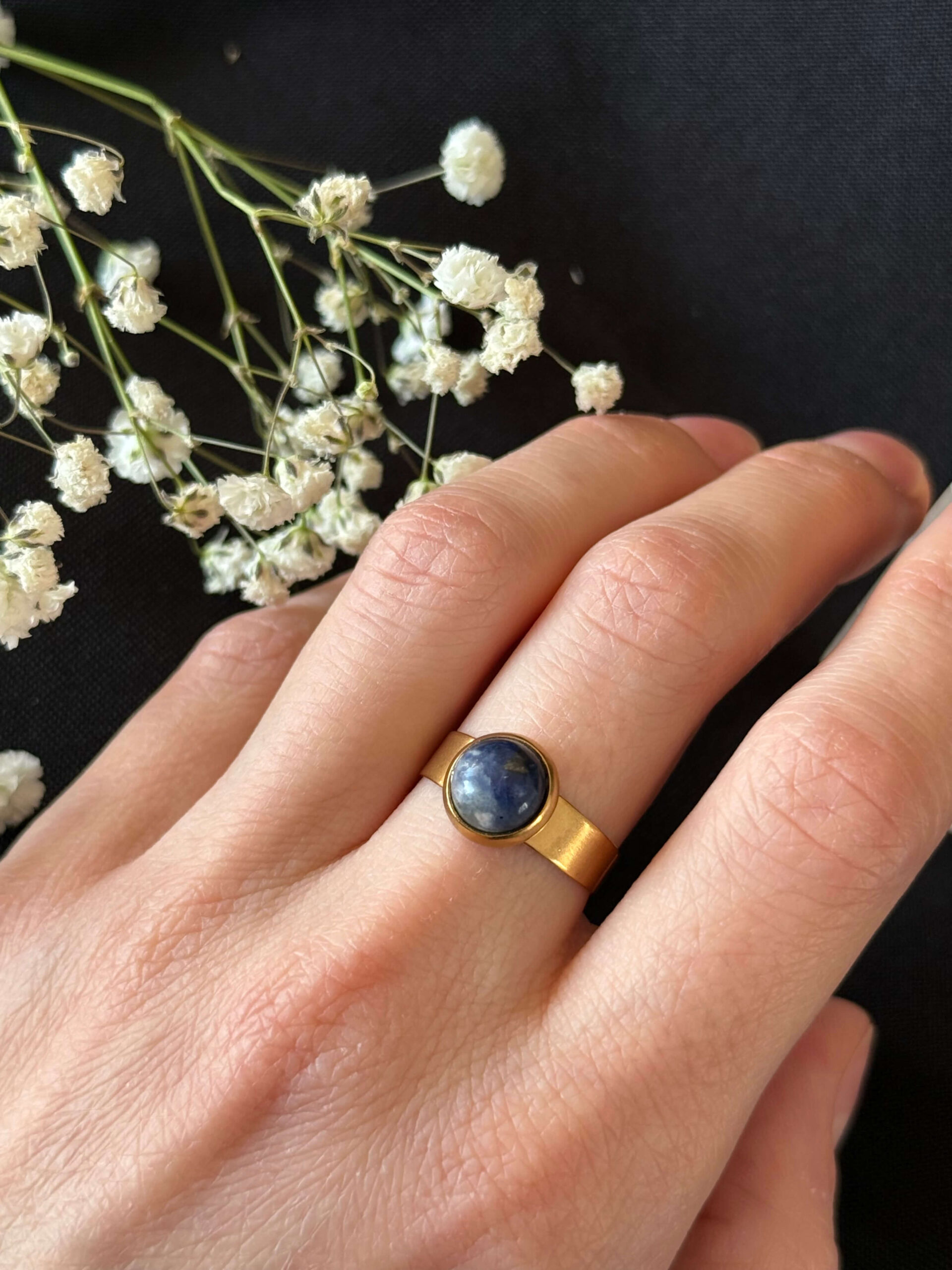 Pierścionek z kaboszonem z sodalitu w okrągłym kształcie na szerokiej obrączce ze stali nierdzewnej pozłacanej.