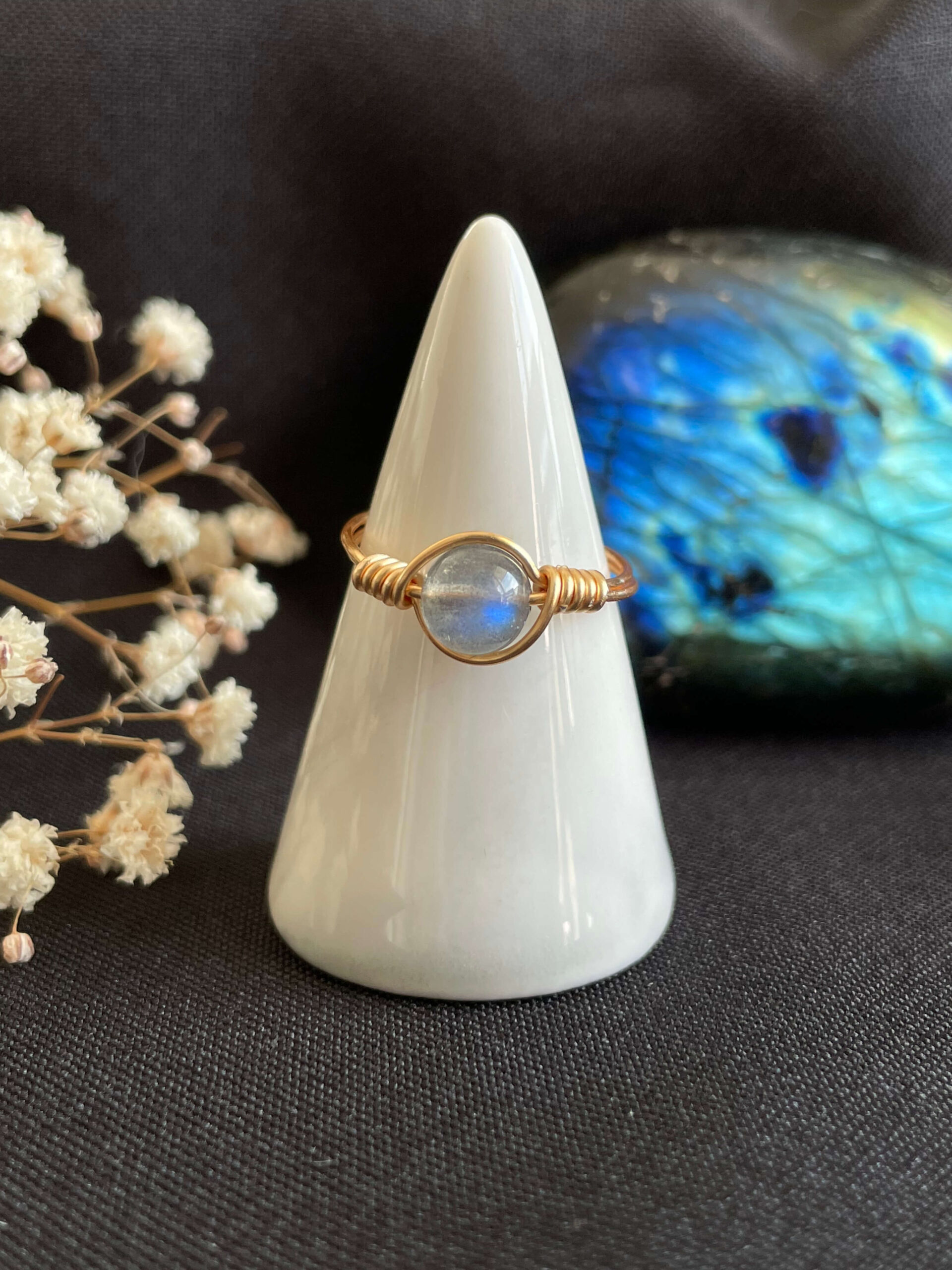 Pierścionek z drutu miedzianego posrebrzanego w kolorze light gold, z kulką labradorytu.