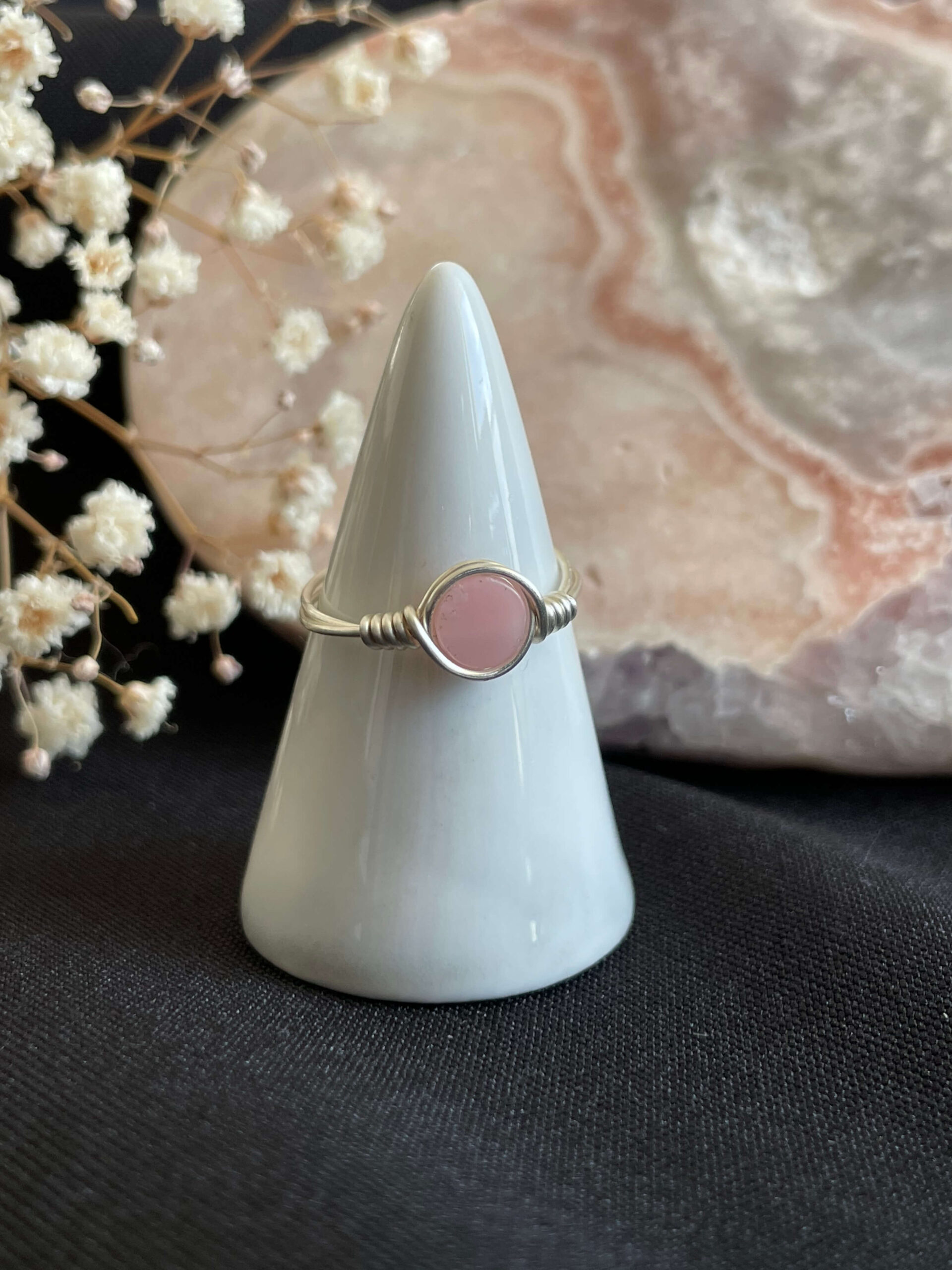 Pierścionek z drutu miedzianego posrebrzanego z pastylką opalu różowego.